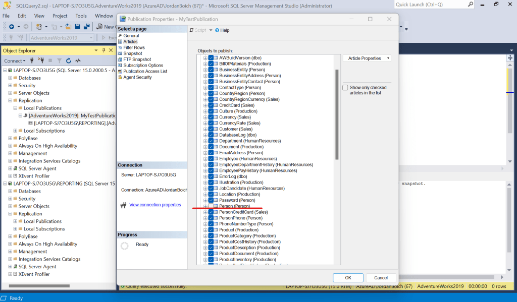 I was ripping my hair out going through this demo myself. The reason for that is because the Person table in the AdventureWorks2019 database does not have a dbo schema. The Person table has a Person schema. So, it’s Person.Person. When using sp_addarticle, if the table or object you’re trying to add has something other than a dbo schema, you must add the @source_owner parameter as shown above and specify the schema. Otherwise, when trying to execute this without that parameter, SQL will yell at you saying “The [table] doesn’t exist in the database.” Bull$#%@!!! I am looking at it right now! I was sitting here for hours going down a deep dive rabbit hole combing the internet trying to figure out why, oh why I was in this nightmare.