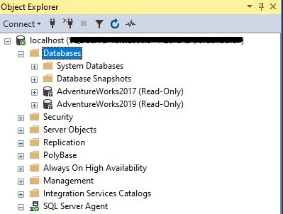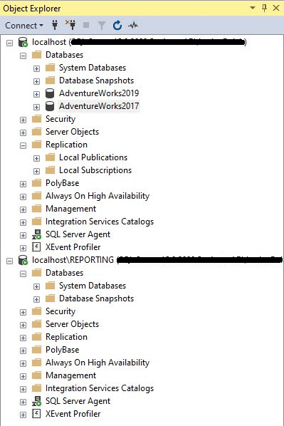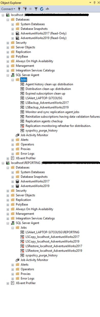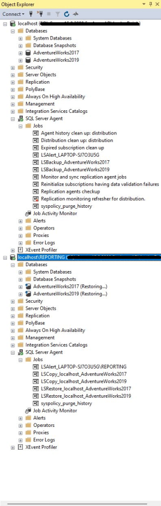 For this demo, I’ll be using two instances of SQL Server installed on the same machine. The source SQL instance will be called localhost, and the destination SQL instance will be called localhost\REPORTING. I’ll be log shipping two databases: AdventureWorks2019 and AdventureWorks2017: