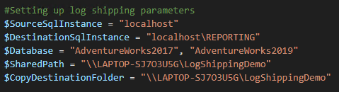 Time to set up some parameters that will be used for our log shipping script. Here’s the template you can use to set up your parameters: